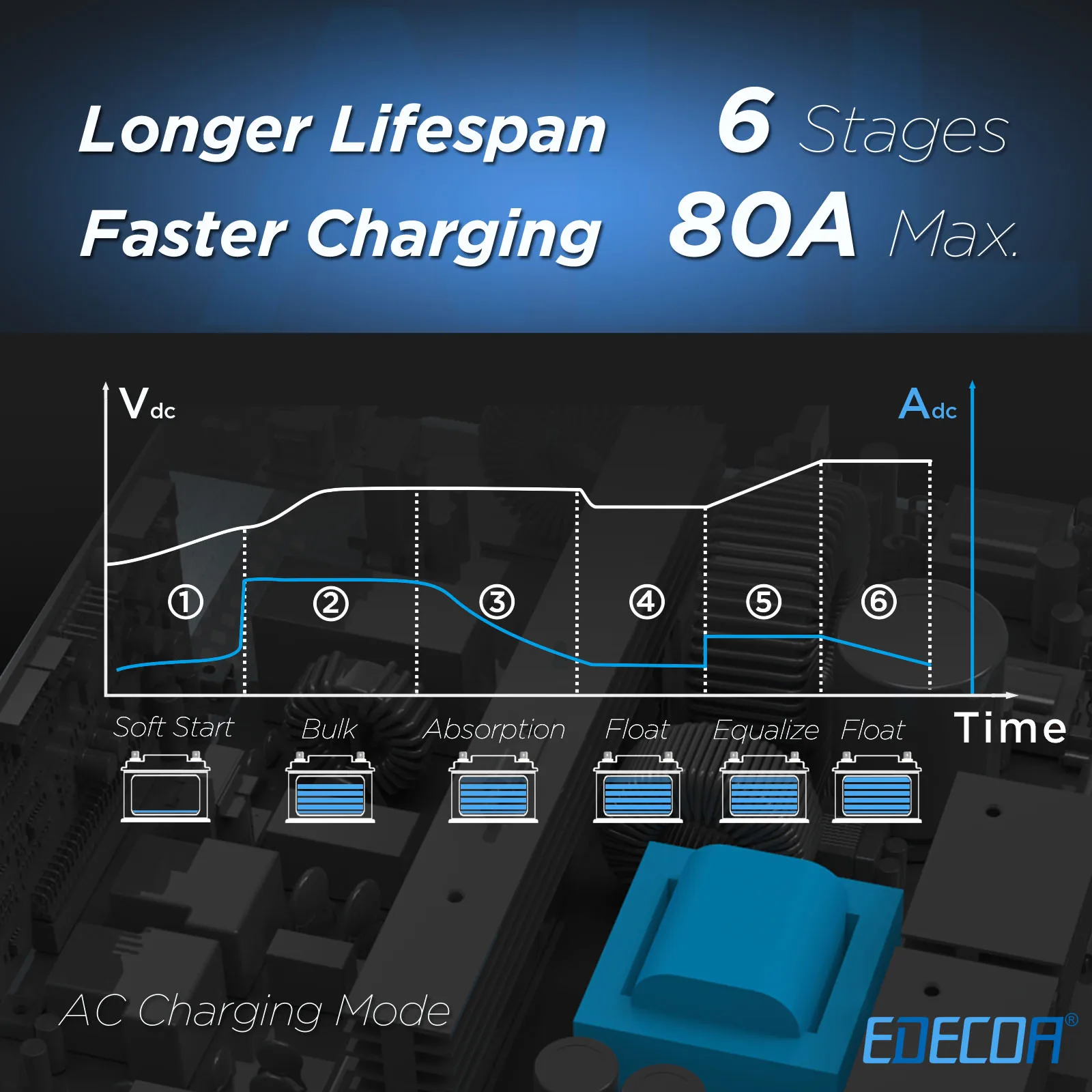 Compatible with multiple battery types: AGM,GEL,LiFePo4,FLD. Customised settings for battery type, charging voltage and current.